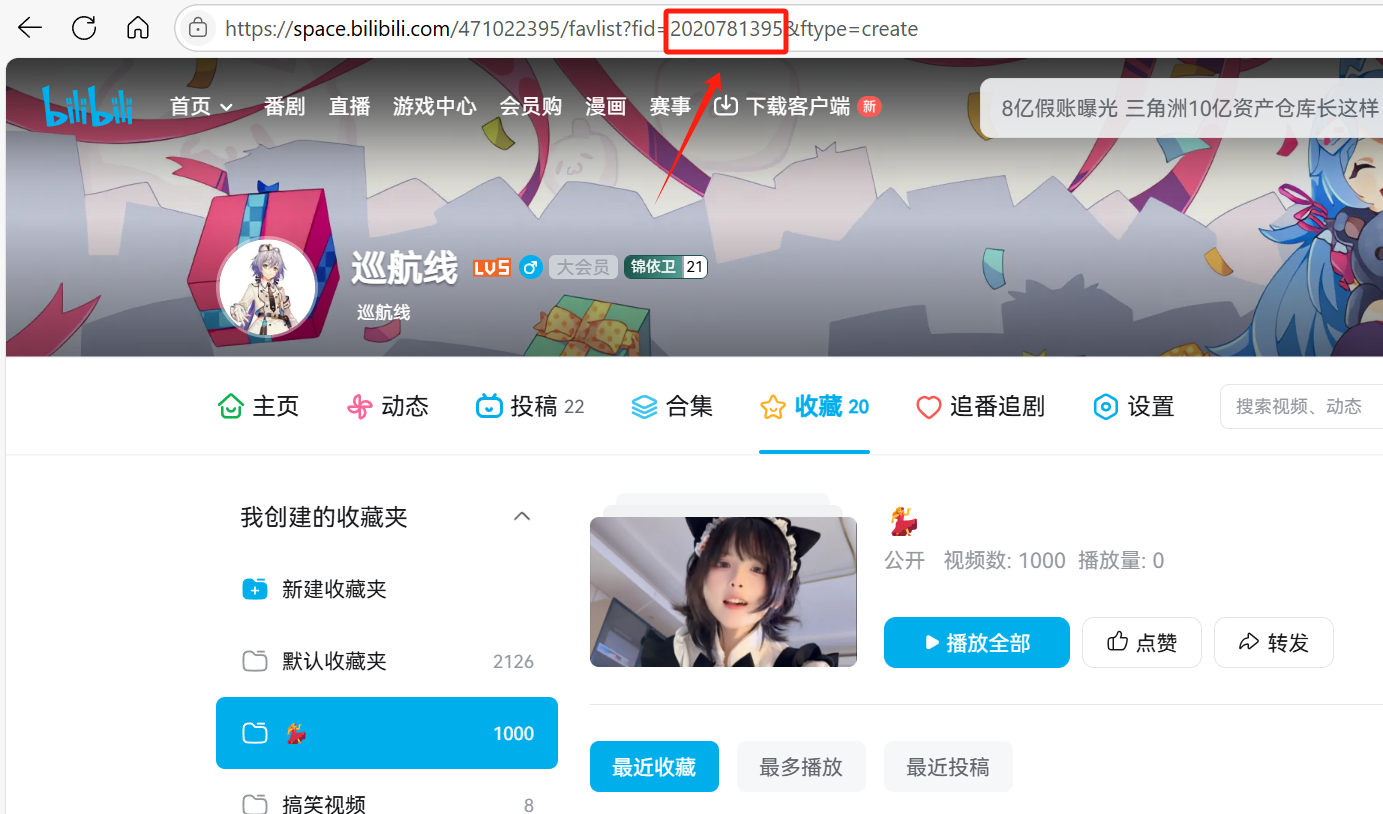 在获取参数后就可以获取到账号的数据了,接下来则是添加需要下载的收藏夹。在[favorite_list]下按照xxxxx = "/media/xxxx"的格式填写,等号前面填写的是收藏夹的ID,后面填写的是media文件夹下的子文件夹。收藏夹ID的获取方法:点入个人收藏夹页面在浏览器显示的网址后面找到fid后面的一串数字,这个即为该收藏夹的ID。