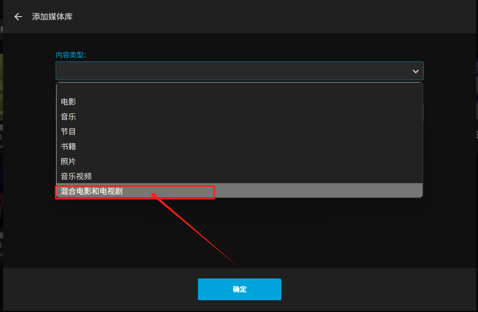 内容类型必须设置为混合电影和电视剧,否则无法正确的显示元数据的内容。