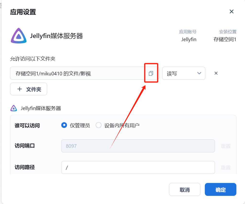在飞牛OS的应用中心中安装Jellyfin服务,随后在应用设置里添加允许访问的文件夹。此文件夹需为docker中/media映射在磁盘的文件夹。