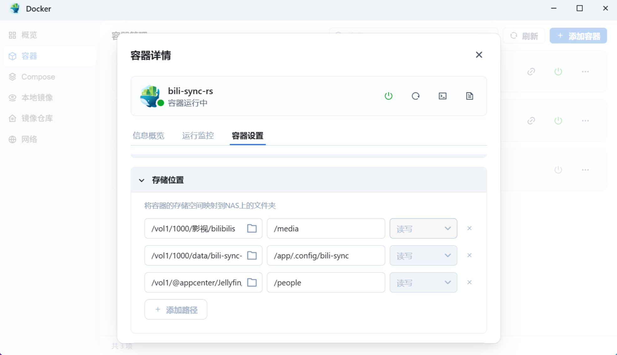 这里的存储位置中除了自带的配置文件夹外我们还需要额外设置用于存储收藏夹的目录/media和头像/people文件夹,这里需要注意的是/people文件夹的映射路径需设置成jellyfin的头像元数据存储目录否则媒体库的视频无法正确加载UP主头像,jellyfin的演员头像路径通常是