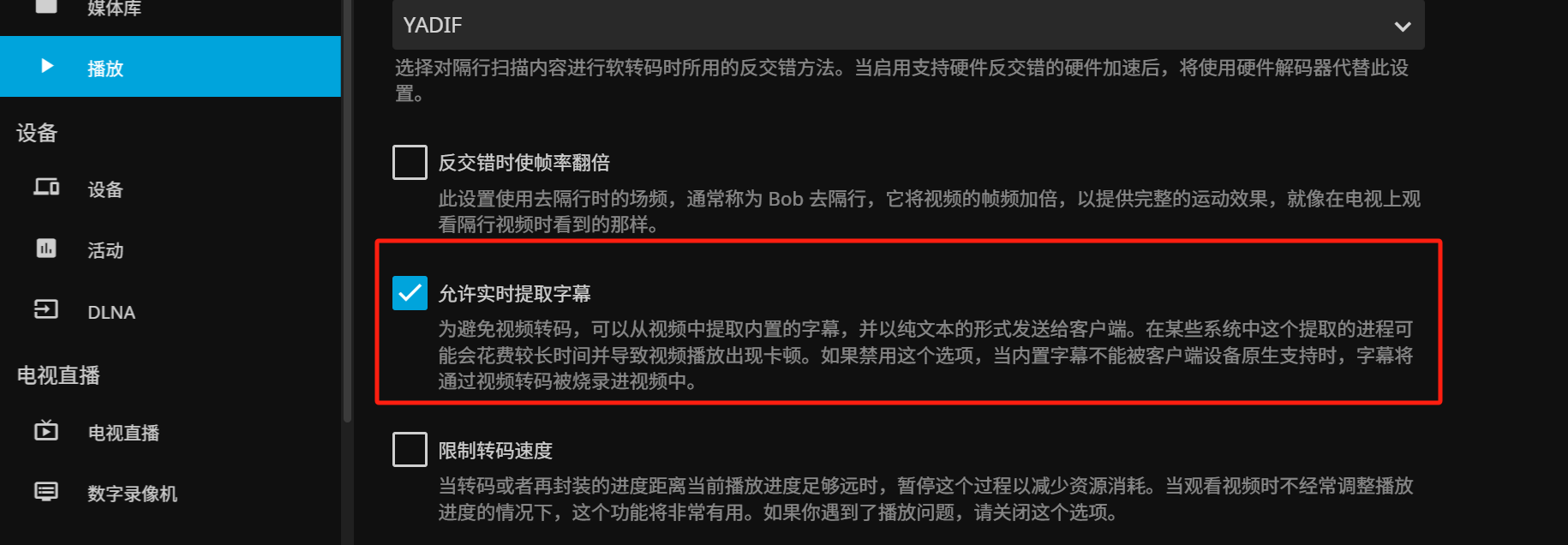 因为我们下载B站视频时已经自带了文件的元数据,所以我们需要将在线刮削的选项全部取消。确保以下及类似选项已经取消勾选,否则会影响媒体库的显示内容。