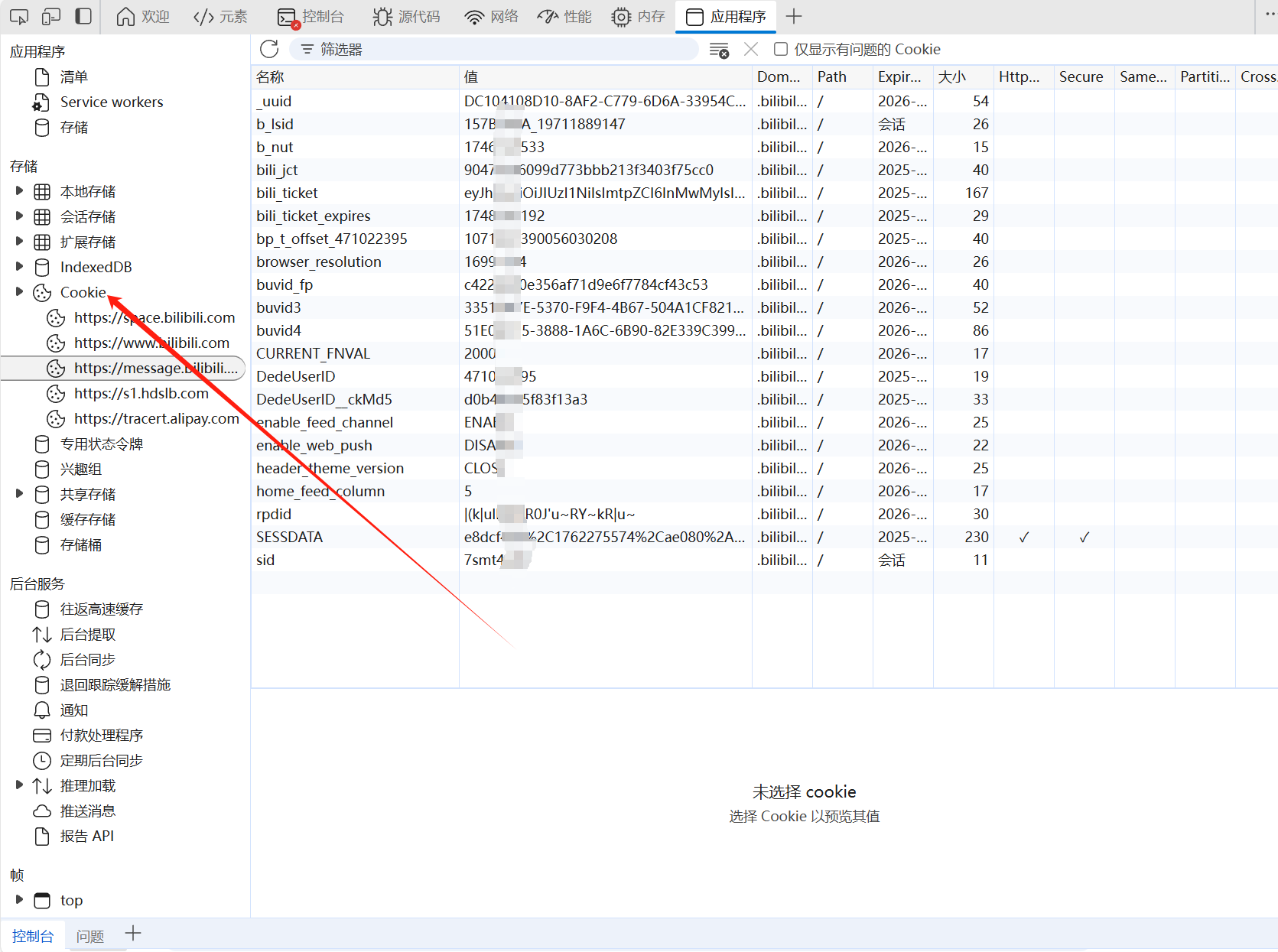 这其中credential部分是需要我们自己在浏览器中去获取的部分。我们首先需要在浏览器中登入自己的B站账号,随后按F12打开开发者工具并切换到应用程序选项卡中选中Cookie组,我们刷新一下可以看到其中包含很多参数,接下来我们只需找出对应参数的值粘贴到配置文件中即可。