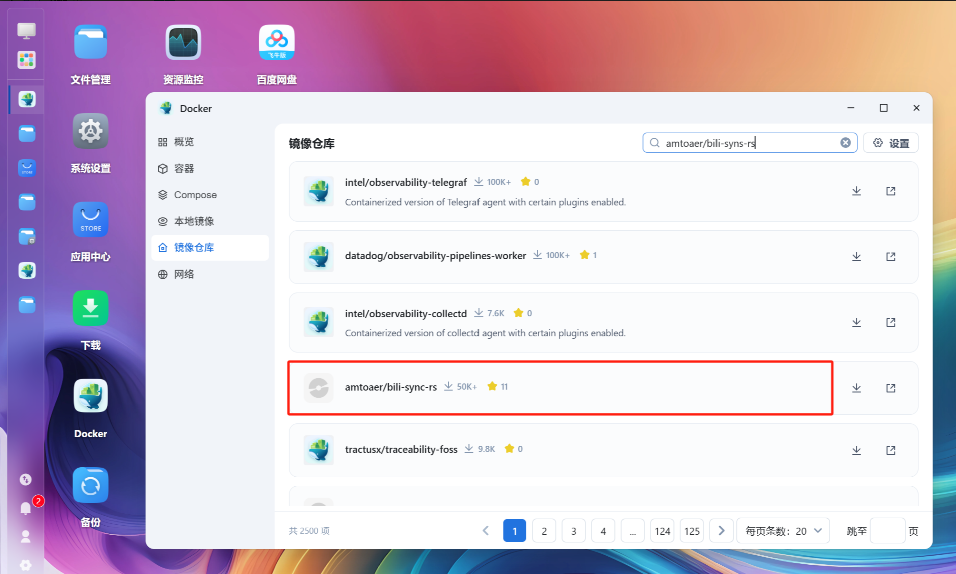 首先打开飞牛OS自带的Docker,在Docker的镜像仓库中搜索amtoaer/bili-syns-rs并下载。